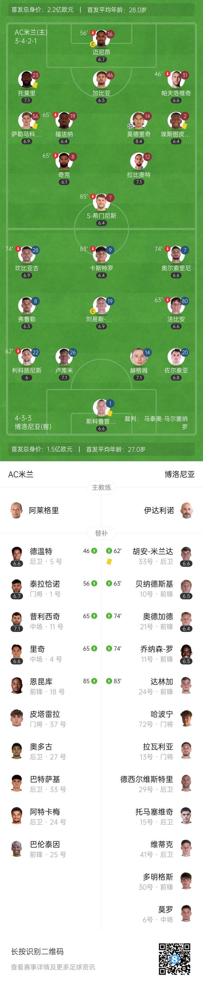 直播吧9月15日讯 北京时间9月15日凌晨2:45,2025-26赛季意甲联赛第3轮,AC米兰坐镇圣西罗球场迎战博洛尼亚。上半场坎比亚吉破门但因越位在先无效,埃斯图皮尼安和S-希门尼斯中柱,米兰暂0-0博洛尼亚;下半场迈尼昂伤退,莫德里奇打进个人米兰生涯首球,里奇和S-希门尼斯中柱,恩昆库禁区内摔倒,VAR介入,主裁判取消点球判罚并向阿莱格里出示红牌,最终AC米兰1-0博洛尼亚,联赛两连胜。