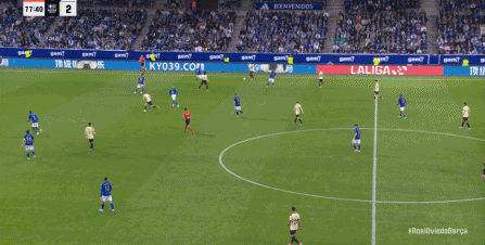 就显得稍好一些,但和开局阶段相比,打出的威胁次数明显降低,这就为奥维耶多在主场的低位防守提升了信心,迫使巴塞罗那只能顺势选择远射: