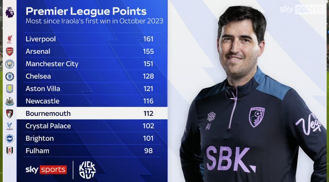 雷速体育10月4日讯 据英国天空体育统计的数据显示,自2023年10月份,伯恩茅斯主帅伊劳拉带队取得首胜之后至今,樱桃军团在英超联赛累计取得了112分,位列英超第七,超越曼联、热刺等传统Big6战队。
